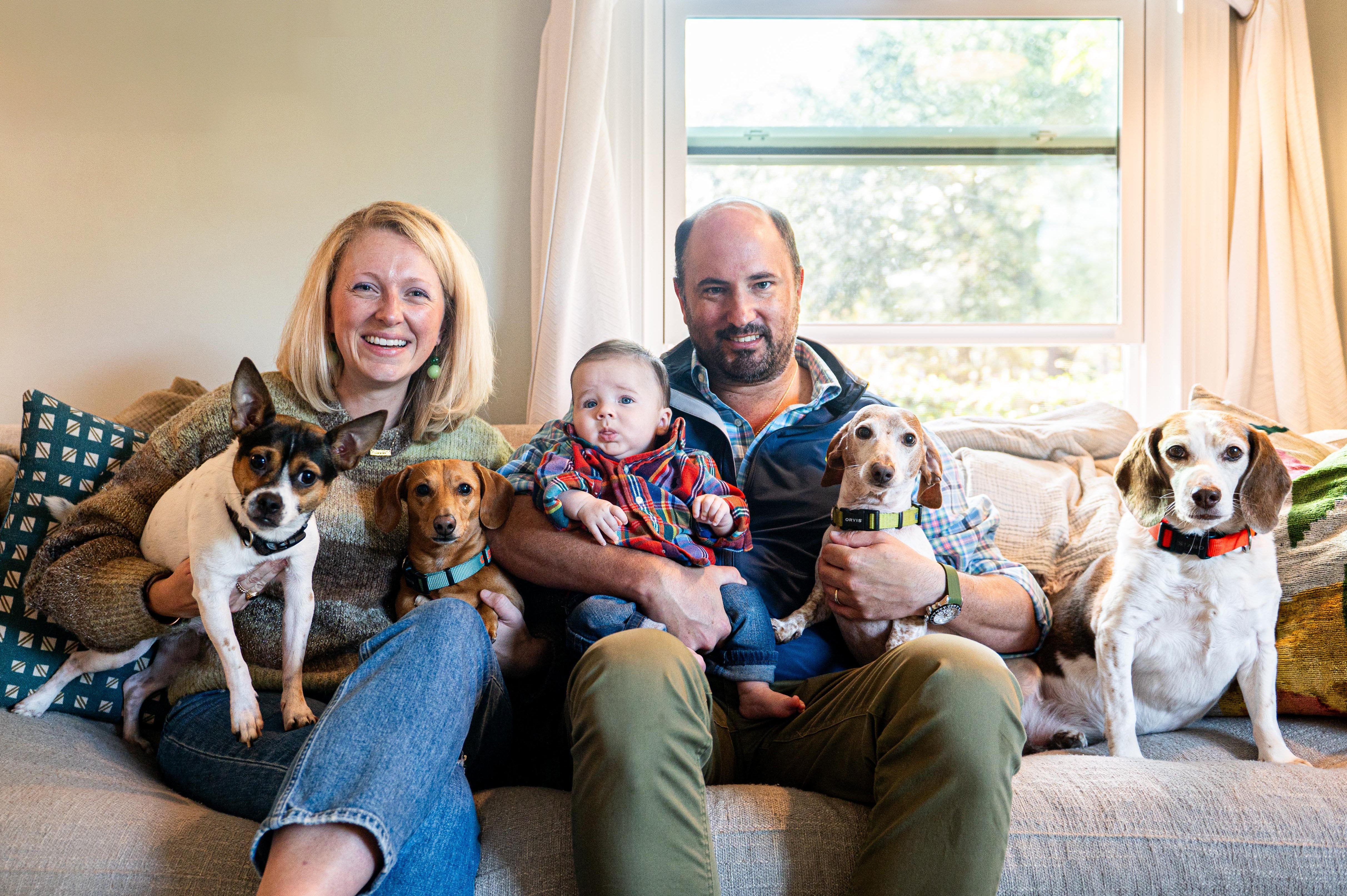 Sarah is originally from Hickory, North Carolina and now lives in Charleston, South Carolina with her husband, Devon, their son, Collins, and their four, dogs, Pickles, Clementine, Waffles, and Beans (pictured above).